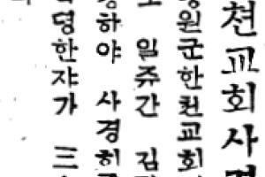 대동군 대보면 찰청리교회에서는 월전에 조승익, 박봉로 양씨를 청하여 사경회를 하는 중 예배당 종을 사기 위하여 연보하였는데 김성훈 장로의 몸시계 한 개 드림을 비롯하여 연보액이 50여원에 달하였다더라.